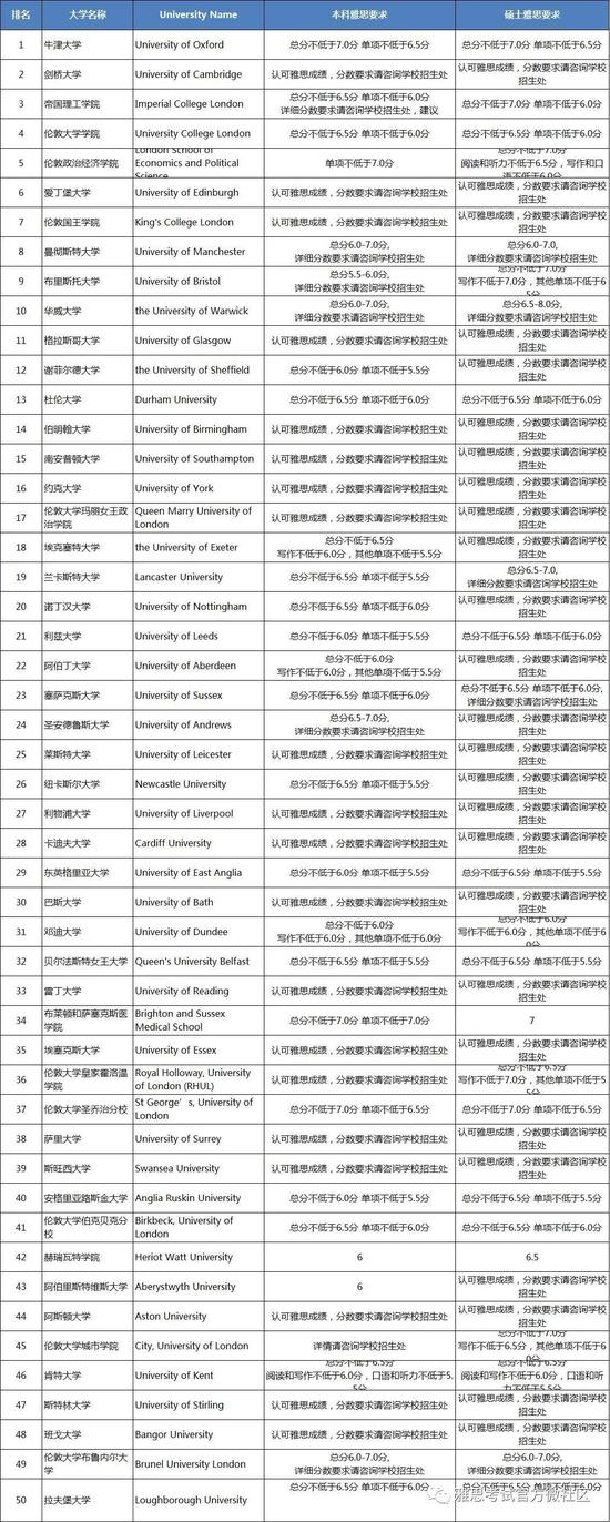 下面是THE排名英国TOP50和雅思成绩要求,来了解下呗: