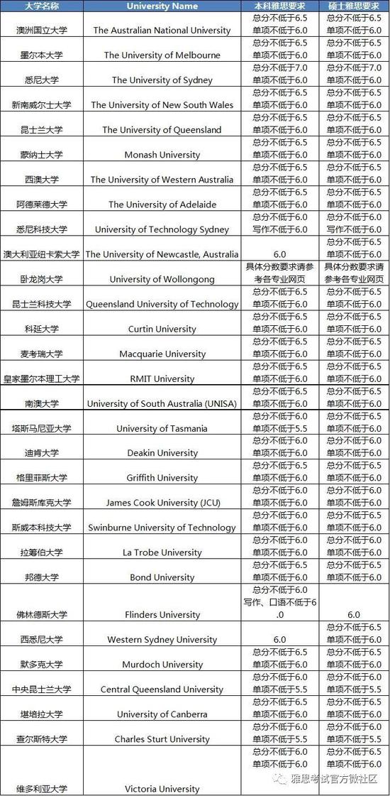 申请澳洲大学通常都需要雅思成绩来证明自己的英语能力,澳洲境内所有的大学和机构都100%认可。我们也为大家准备了QS排名中澳洲TOP30院校雅思成绩的要求,拿走不谢~